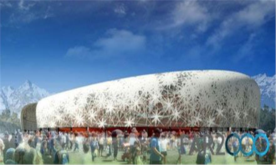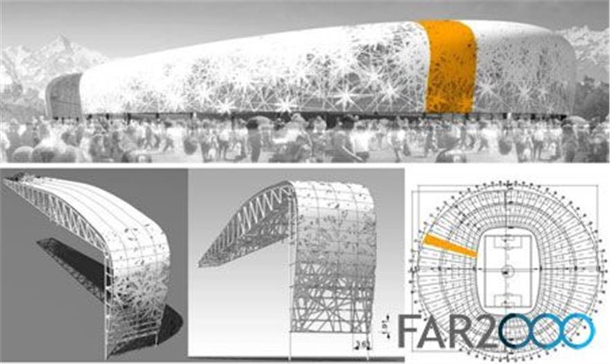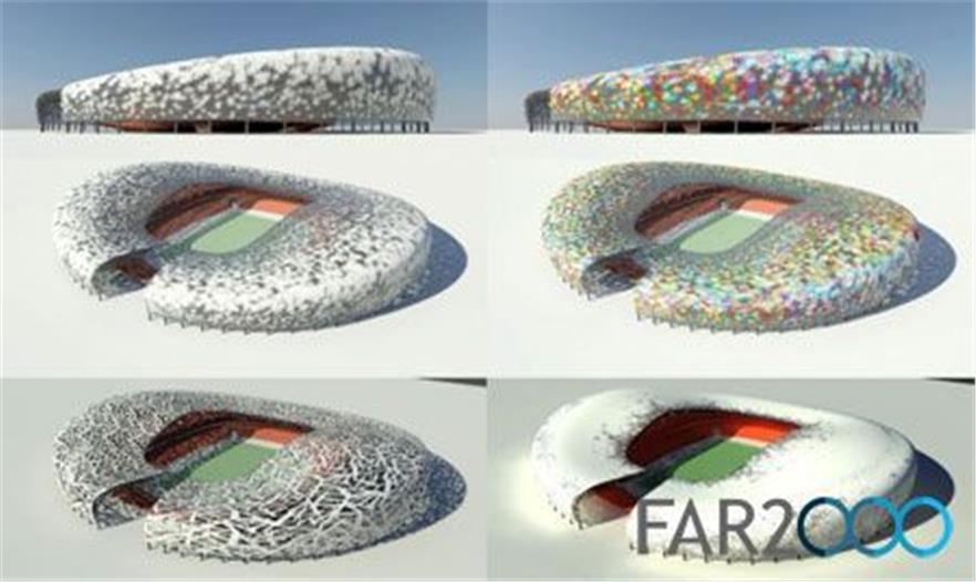 在現(xiàn)有總體規(guī)劃的基礎(chǔ)上,設(shè)計組提議“以凍霧為形式表現(xiàn)夾著雪的旋風(fēng)降臨到奧林匹克場館”,也就是用裝飾性的鋁質(zhì)或合成材料(如Apolic)穿孔板覆蓋在承重結(jié)構(gòu)的邊上。夜晚,LED照明將燈光投射在建筑商,形成燈海一般的“雪景”。