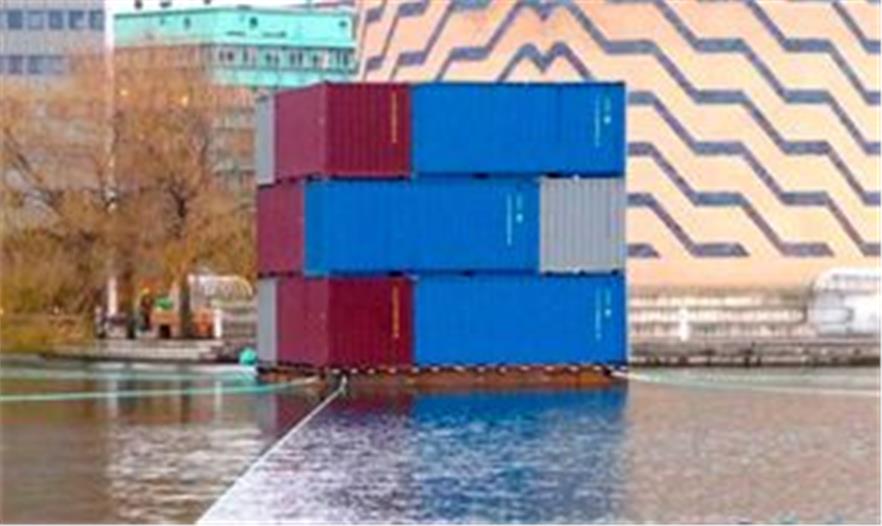 這座立方體用十幾個(gè)集裝箱建造,以相互連接的方式堆疊在一座定制的飄浮駁船上。立方體的兩邊覆蓋了網(wǎng)線,能夠在上面放映錄像片段,而另外兩邊則暴露出了原集裝箱的材料。