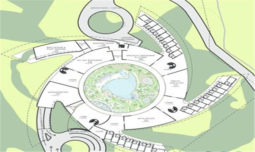 盡管當(dāng)?shù)氐慕ㄖò覆辉试S這里的建筑超過兩層,但單體的飯店樓身還是顯現(xiàn)出與眾不同的設(shè)計(jì)感。飯店的核心部分是餐廳、洗浴中心、健身俱樂部、咖啡館、大型泳池和套房。從核心部分開始,飯店輻射出5個(gè)分支,兩層樓的飯店客房都向景觀部分打開。站在每一間客房的陽臺(tái)都能欣賞到戶外的獨(dú)特景致。