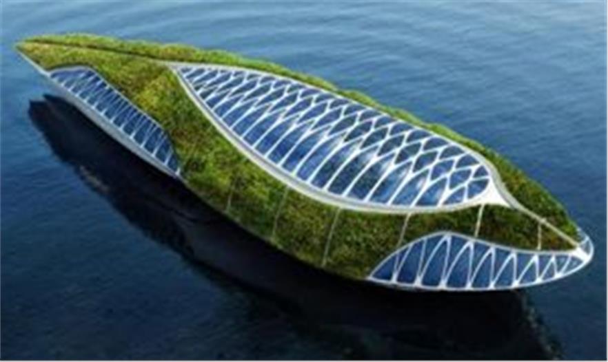 設計師Vincent Callebaut Architect從全球性氣候、能源問題出發(fā)設計的綠色生態(tài)系統(tǒng),零碳排放的架構(gòu)是基于可再生能源。這是一個巨型的海上漂浮物,也可以稱為兩棲艦艇,從整體形態(tài)來看采用來仿生的設計,像一頭巨鯨正在大海中游弋。它的“身軀”上被一層綠色的生態(tài)植物覆蓋,頂部的光伏太陽能電池和液壓氣動薄膜是這個巨型公園的動力支撐,其內(nèi)設計了完善的生態(tài)系統(tǒng)。