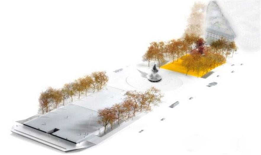 2.2 中心紀(jì)念碑,位于廣場(chǎng)的中心,看起來(lái)像是人流中的一座小島。我們提議為廣場(chǎng)修建一個(gè)地基建筑,這個(gè)建筑略略傾斜,形成一種火山式的結(jié)構(gòu)。行人可以繞著紀(jì)念碑走,也可以在紀(jì)念碑的影子下歇息。