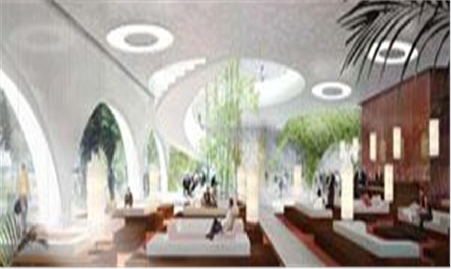 飯店的南北兩座城市廣場形成了進(jìn)入飯店和會議中心的天然入口,并以兩座金色的拱門來突出。飯店客房都是一個模式,衛(wèi)生間十分豪華寬大,光線充沛,視野開闊,可看到外面的綠色景觀。