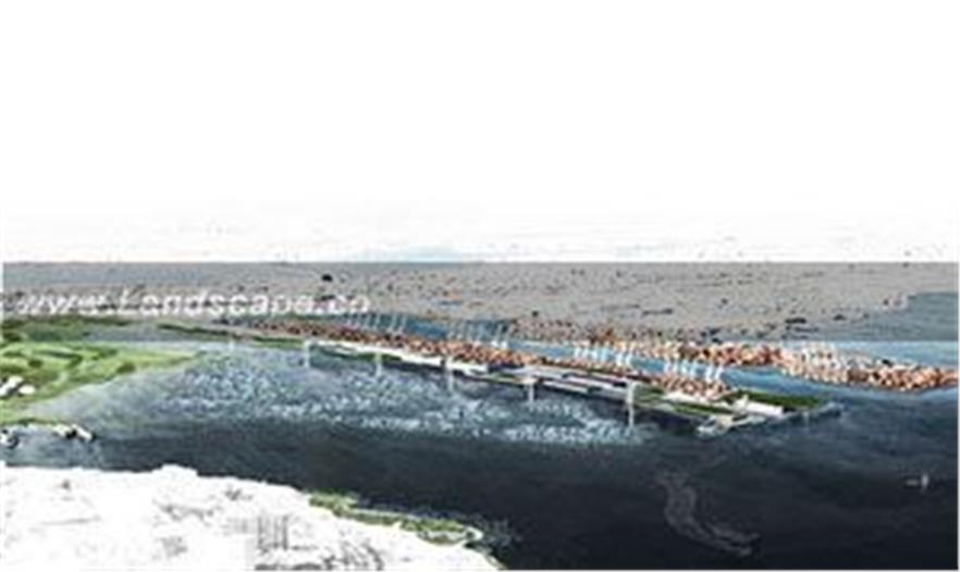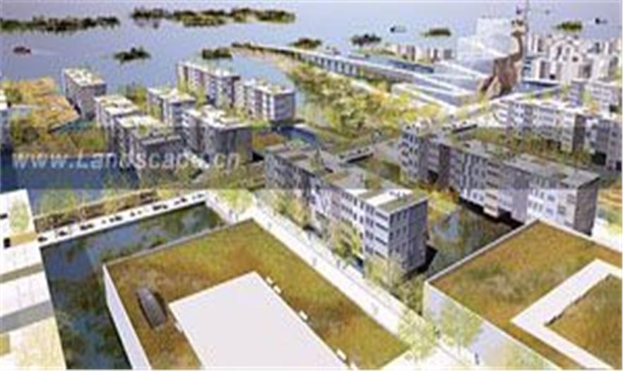 3區(qū)的景色,新的水城,展示了吊在橋型結(jié)構(gòu)上的居住建筑、漂浮濕地和防波堤