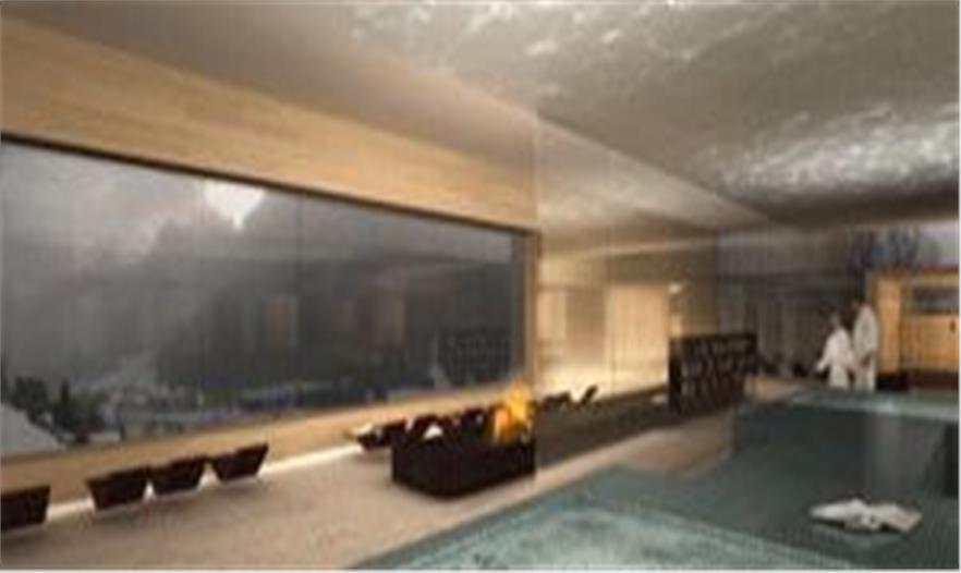 飯店客房和其他設施可從中庭抵達,所有的服務設施和廢物的處理、廚房等都位于飯店的后部。健身區(qū)在一層,將普通游客和穿著浴袍的客人隔開。泳池、飲料吧等構(gòu)成了一個天然的區(qū)域,屋頂桑拿區(qū)還有一個外部池塘,但觀景平臺外部是看不到的。泳池邊和隱蔽的露臺上都能欣賞到全景式的山巒景色。