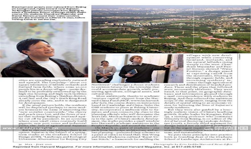 But in this one case, perhaps there is an option. Sujiatuo is the subject of a springterm studio at the Graduate School of Design (GSD). “Landscape and Ecological Urbanism: Alternatives for Beijing City Northwest” challenges a dozen students to envision futures for the township that could accommodate growth while preserving agriculture, ecological assets, and cultural sites. More ambitiously, thanks to academic “venture capital” support from the Harvard China Fund (HCF; www.fas.harvard.edu/~hcf), the course draws on instructors based in Cambridge and China; links the GSD students to peers at Peking University; incorporates a midterm visit to Sujiatuo; and even connects the class to the planning officials who will determine the area’s fate. Much as Sujiatuo is a short story in the epic of China’s modern development, the studio provides a small window into Harvard’s academic ambitions in the People’s Republic, and around the world.