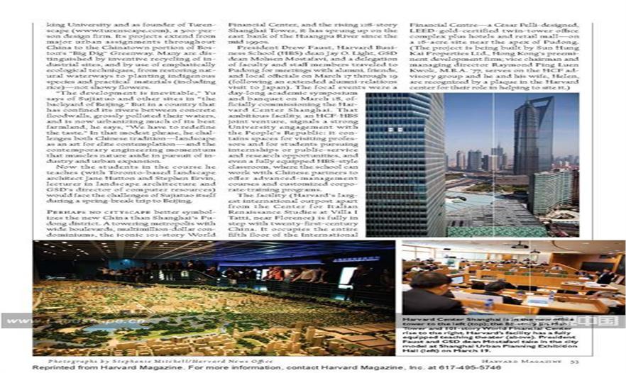 President Drew Faust, Harvard Business School (HBS) dean Jay O. Light, GSD dean Mohsen Mostafavi, and a delegation of faculty and staff members traveled to Pudong for meetings with alumni, friends, and local officials on March 17 through 19 (following an extended alumni-relations visit to Japan). The focal events were a day-long academic symposium and banquet on March 18, officially commissioning the Harvard Center Shanghai. That ambitious facility, an HCF-HBS joint venture, signals a strong University engagement with the People’s Republic: it contains spaces for visiting professors and for students pursuing internships or public-service and research opportunities, and even a fully equipped HBS-style classroom, where the school can work with Chinese partners to offer advanced-management courses and customized corporate-training programs.