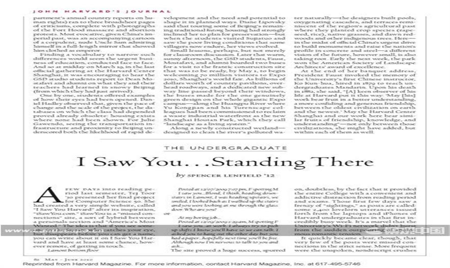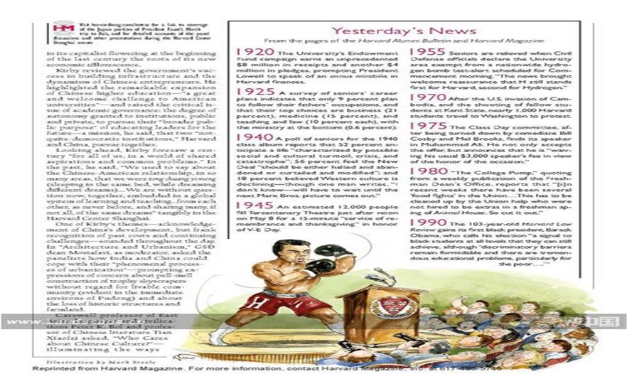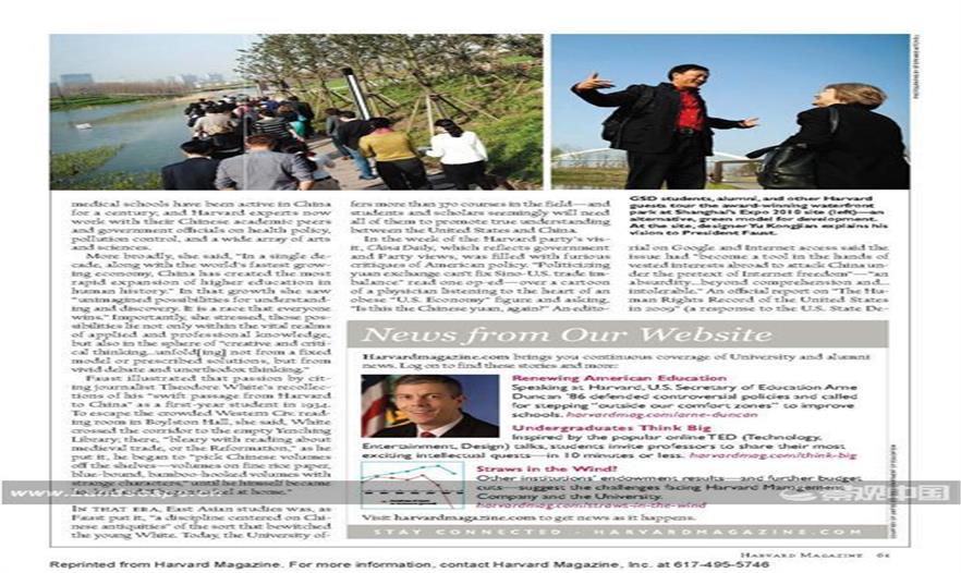 In that era, East Asian studies was, as Faust put it, “a discipline centered on Chinese antiquities” of the sort that bewitched the young White. Today, the University offers more than 370 courses in the field—and students and scholars seemingly will need all of them to promote true understanding between the United States and China. In the week of the Harvard party’s visit, China Daily, which reflects government and Party views, was filled with furious critiques of American policy. “Politicizing yuan exchange can’t fix Sino-U.S. trade imbalance” read one op-ed—over a cartoon of a physician listening to the heart of an obese “U.S. Economy” figure and asking, “Is this the Chinese yuan, again?” An editorial on Google and Internet access said the issue had “become a tool in the hands of vested interests abroad to attack China under the pretext of Internet freedom”—“an absurdity…beyond comprehension and…intolerable.” An official report on “The Human Rights Record of the United States in 2009” (a response to the U.S. State De- partment’s annual country reports on human rights) ran to three broadsheet pages of criticisms, complete with photographs of the Fort Hood massacre and abortion protests. Most evocative, given China’s imperial past, was an accompanying cartoon of a corpulent, nude Uncle Sam admiring himself in a full-length mirror that showed him clothed as emperor.