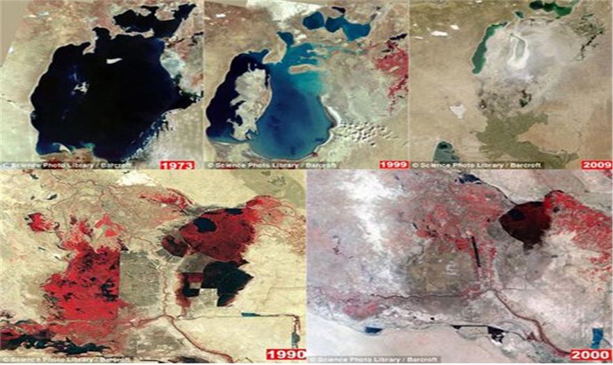 分別于1973年和2009年拍攝的衛(wèi)星照片顯示,咸海的水量在緩慢地不斷地減少。咸海已由以前如同愛爾蘭面積那么大的水面縮小至數(shù)個受到污染的池塘。咸海是一個內(nèi)陸湖泊,位于烏茲別克和哈薩克斯坦之間,它曾是世界最四大湖泊。自六十年代以來,它已損失了超過一半的水量。水量減少是由于湖泊上游河流被過度利用。前蘇聯(lián)六十年代改變了錫爾河和阿姆河的流向以灌溉棉花地和稻田地。五十年后,咸海的水量已是項目開始時的百分之十。影響是如此之大,當(dāng)?shù)氐臍夂驌?jù)信因此改變,污染上升至危險的層度。咸海的破敗還毀滅了當(dāng)?shù)氐牟遏~業(yè),造成嚴重的失業(yè)問題,使當(dāng)?shù)鼐用衩媾R經(jīng)濟困境。