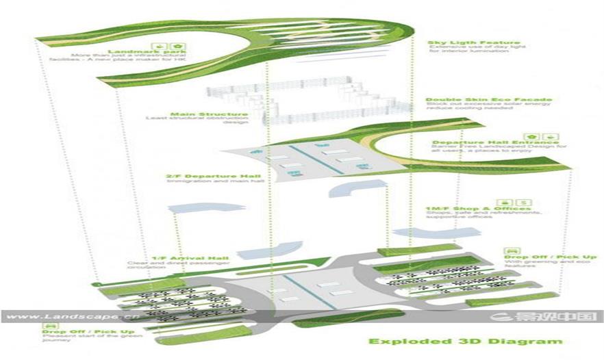 由于香港口岸每天都會(huì)承受很大的車流量,大量汽車尾氣有待處理,項(xiàng)目采取了一個(gè)簡約卻優(yōu)雅的處理辦法:拓展綠地——綠化樹種以及當(dāng)?shù)氐泥l(xiāng)土樹種將把二氧化碳轉(zhuǎn)換為氧氣,并過濾調(diào)空氣中的污染物。種植設(shè)計(jì)同時(shí)兼顧降低噪音,提供可坐區(qū)域以及優(yōu)美的居住環(huán)境等功能。所有設(shè)計(jì)將提供給公眾最大限度享受到的地標(biāo)性場(chǎng)所。