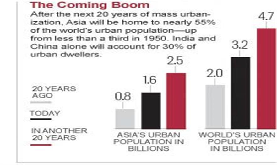 20年后,亞洲城市人口占全球城市人口比例將由1950年時(shí)的三分之一增至55%,印度和中國將擁有全球30%的城市人口。20年前、今天和20年后世界城市人口總數(shù)分別為20億、32億和47億,同期亞洲城市人口數(shù)量為8億、16億和25億。