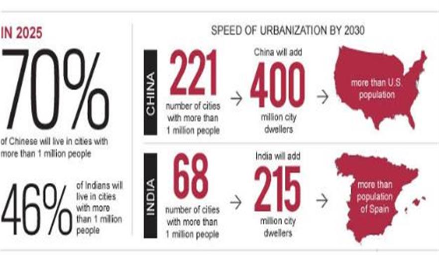 到2025年,70%的中國人將生活在人口數(shù)量過百萬的城市里,印度的這一比例為47%。到2030年,中國將擁有人口過百萬的城市221座,新增城市居民4億,超過美國全國人口。印度人口過百萬的城市將達(dá)68座,新增城市居民2.15億,超過西班牙全國人口。