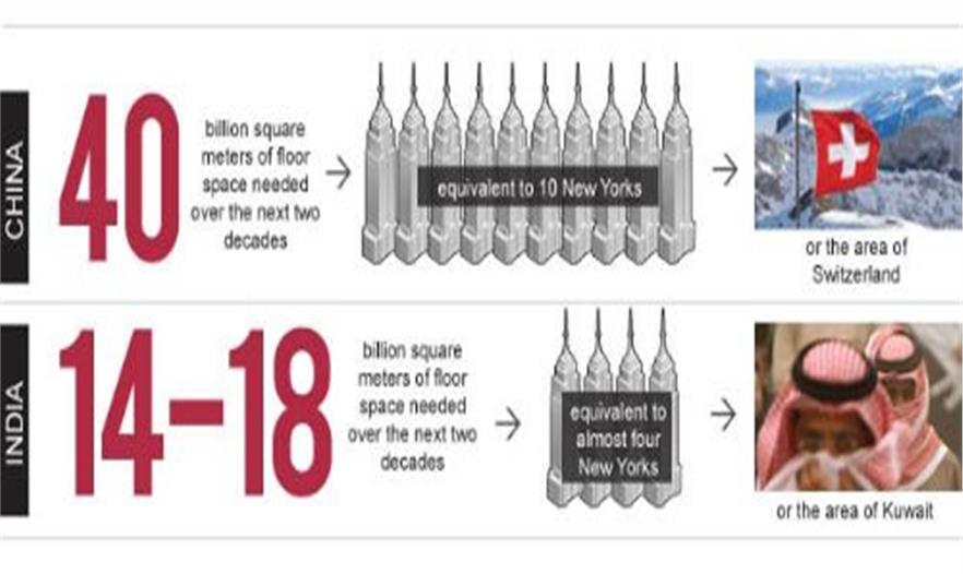 如果保持目前的發(fā)展趨勢,中國未來20年需要新增400億平方米的商住綜合建筑,相當(dāng)于每兩年增加一座紐約城。印度則每年需要新增7000至9000萬平米的建筑面積,相當(dāng)于每年兩座孟買或一座芝加哥。
