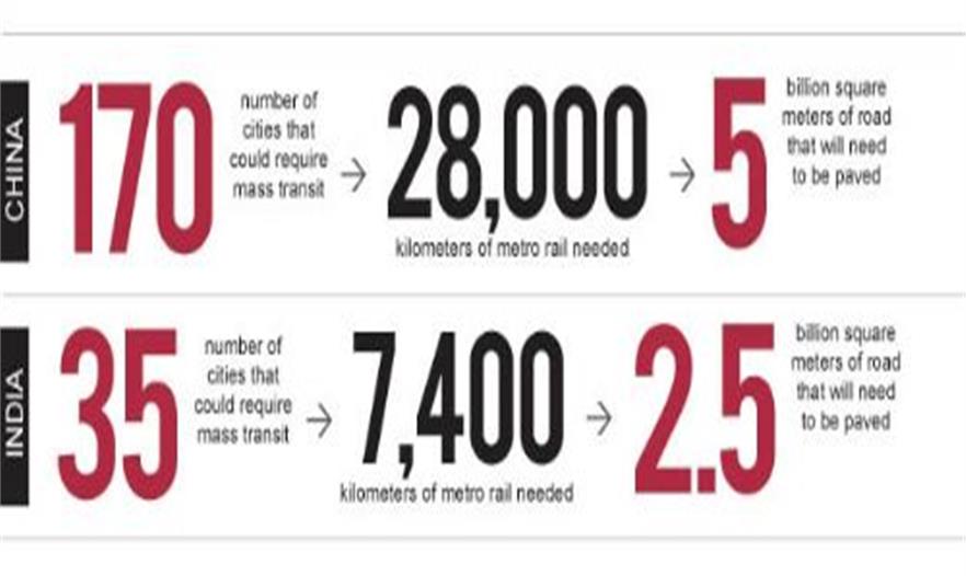 中國170座城市需要大型交通系統(tǒng),要建地鐵2.8萬公里,道路50億平米;印度35座城市需要大型交通系統(tǒng),建地鐵7500公里,道路25億平方米。