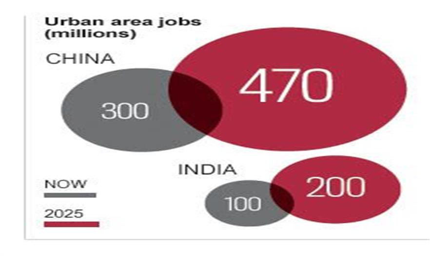 城市就業(yè)將比農(nóng)村地區(qū)更加普遍且收入更高,中國年增長26%的大學(xué)畢業(yè)生大部分會在城市工作,印度城市新增就業(yè)職位的四分之三在服務(wù)部門。
