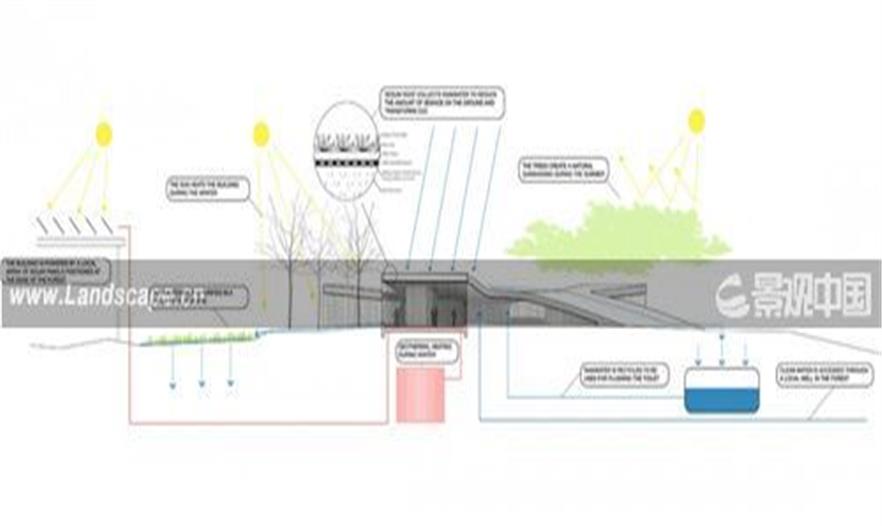 該建筑使用的能源來自于數(shù)組安放在森林邊緣的太陽能接收板,這也是該建筑同周圍城市能源供給網(wǎng)絡(luò)的唯一連接部分。在太陽能最充足的時(shí)段,該裝置能產(chǎn)生比需求更高的能量,并將多余的能量輸送回能源供給網(wǎng)絡(luò),使“自然中心”成為一座名副其實(shí)的產(chǎn)能建筑。
