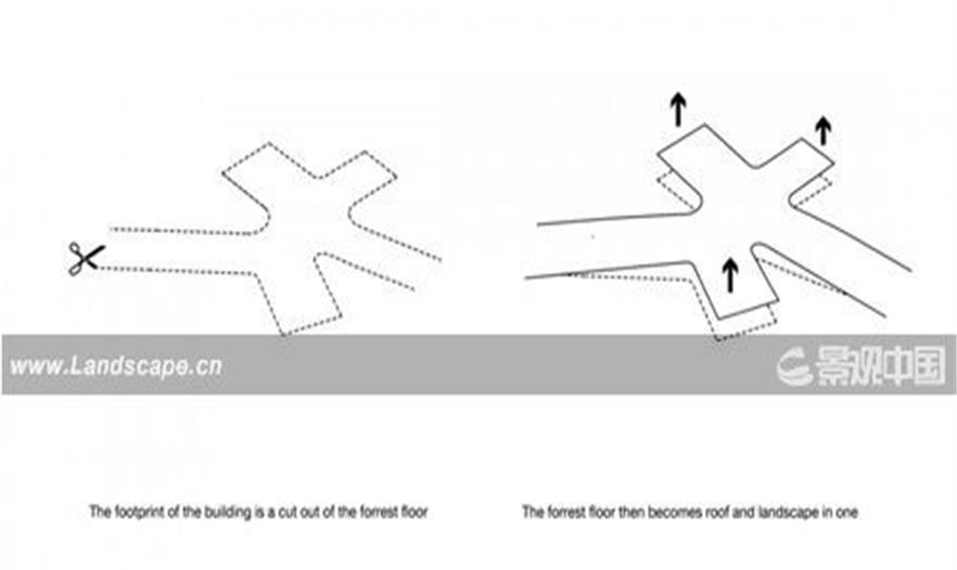 這個(gè)建筑設(shè)計(jì)形式十分簡(jiǎn)約,五角星形狀的屋頂構(gòu)成了抬升性景觀,提供了一整塊場(chǎng)地可以觀賞森林風(fēng)景。而且,五個(gè)側(cè)廳中的兩個(gè)的屋頂向地面傾斜,使其具有可達(dá)性,同森林融為一體。游客們進(jìn)入森林時(shí)可以選擇是從下穿過建筑內(nèi)部或是從上跨越建筑屋頂。建筑正面的地面上是從山體上切割而出的各式各樣的護(hù)墻。各種類型護(hù)墻的位置被精心設(shè)置,其中兩處的地面與環(huán)境是處于同一水平面,這樣的設(shè)計(jì)可以使通向中央大廳、展覽區(qū)及森林的入口保證暢通。