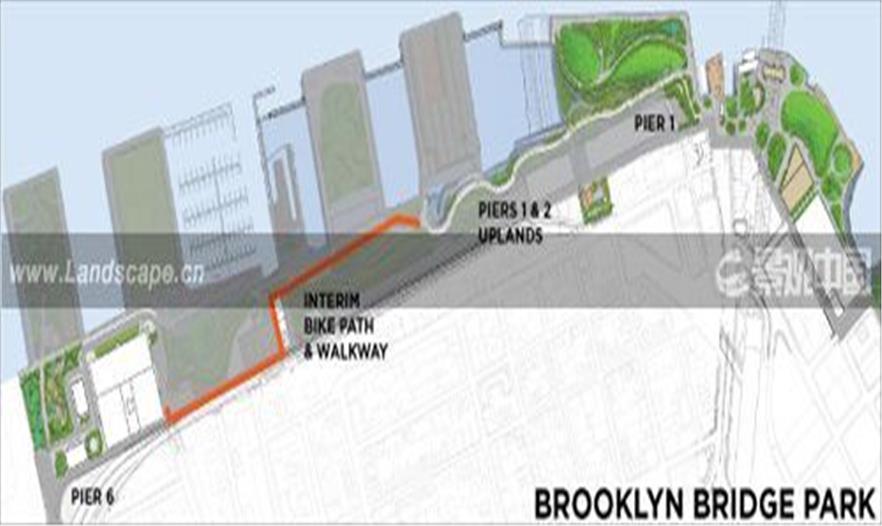 占地5英畝的布魯克林大橋公園已向公眾開放,包括初段的2000英尺公園綠道——綠道寬30英尺,由沿紐約東河(the East River)河濱的自行車道和游步道組成。新綠道的第一段始于Old Fulton街, 到布魯克林2號碼頭結(jié)束,大約擁有向南延伸2000英尺的場地。
