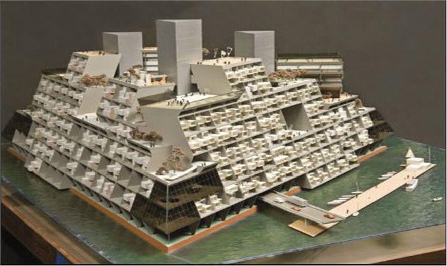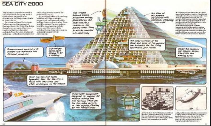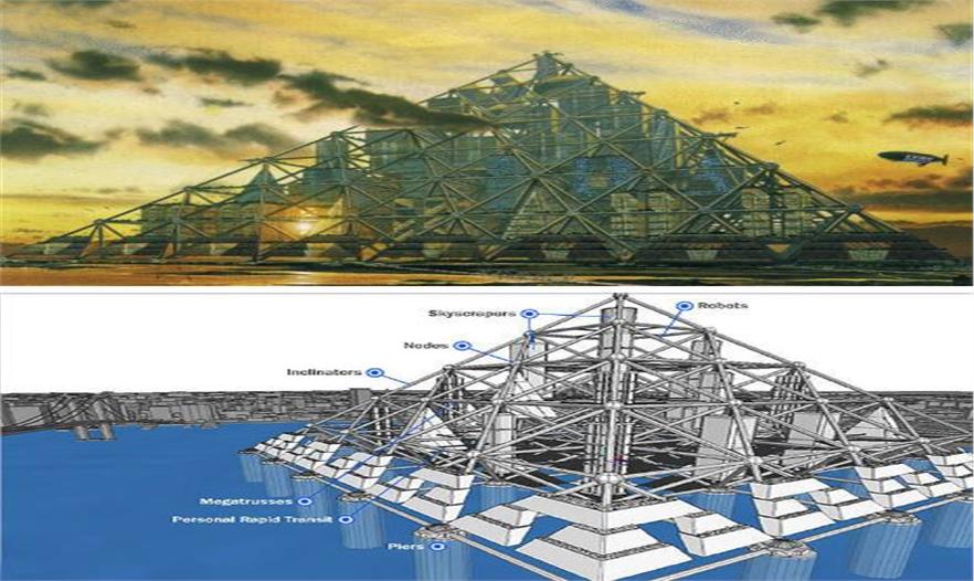 基于巴克明斯特·富勒和世界生態(tài)建筑之父保羅·索萊里提出的概念,這座漂浮的金字塔式建筑上蓋滿了太陽(yáng)能電池板。金字塔上有公寓、商店、花園以及學(xué)校,水下設(shè)備將支持養(yǎng)魚(yú)場(chǎng)和海底礦床開(kāi)采等活動(dòng)。