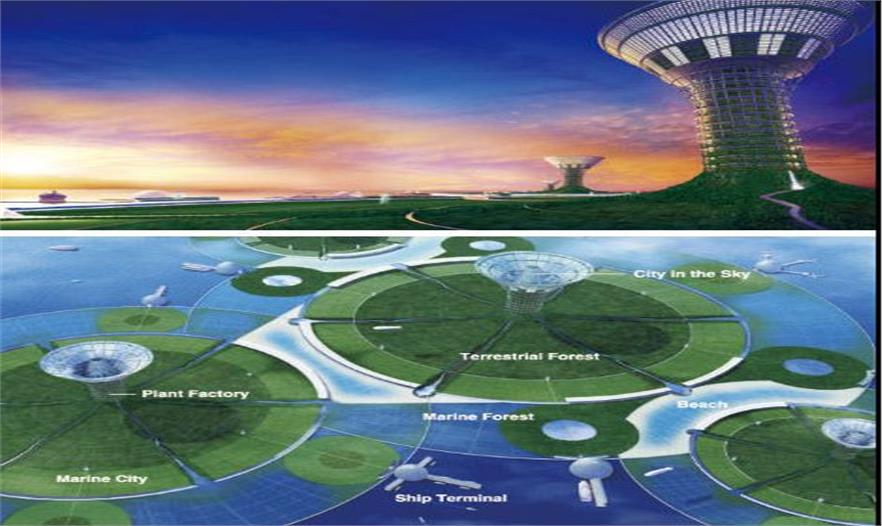 清水公司設(shè)計(jì)的綠色漂浮城,就像一座漂浮的天空城。整座城市就像坐落在盛開(kāi)的百合花座上,每棟摩天樓都將高達(dá)1600多米,容納100萬(wàn)人,每棟建筑都有自己的垂直花園。