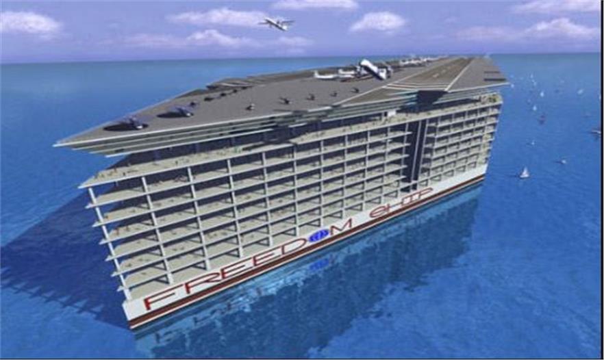 從審美學(xué)上來(lái)說(shuō),自由之船不能與其他漂浮城市的概念圖相提并論,但卻是最容易實(shí)現(xiàn)的。1600多米長(zhǎng)的大游船可以容納50萬(wàn)人,上面有住宅艙、工作間、零售商店、教育場(chǎng)所以及衛(wèi)生機(jī)構(gòu)。船頂上是飛機(jī)跑道,并設(shè)有艙口進(jìn)出小船。