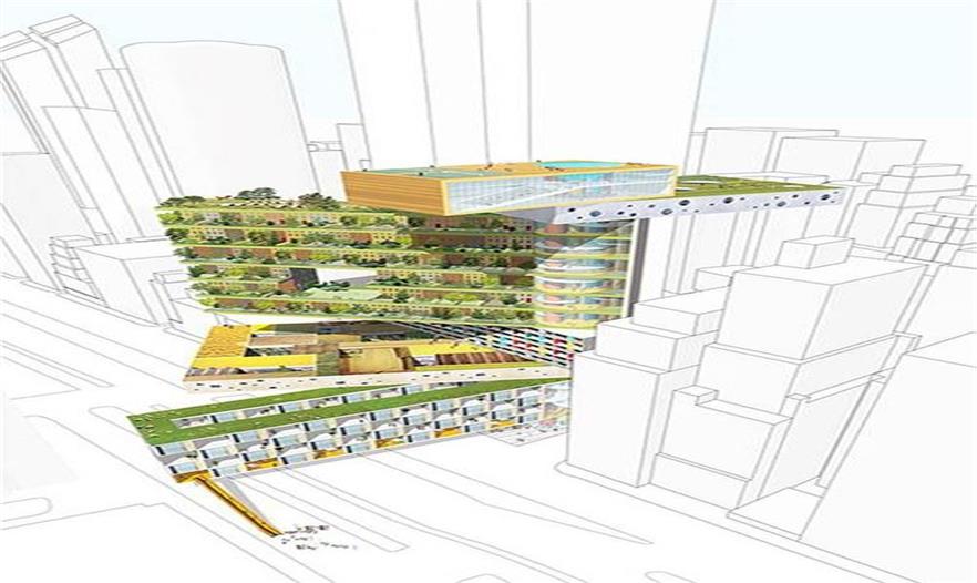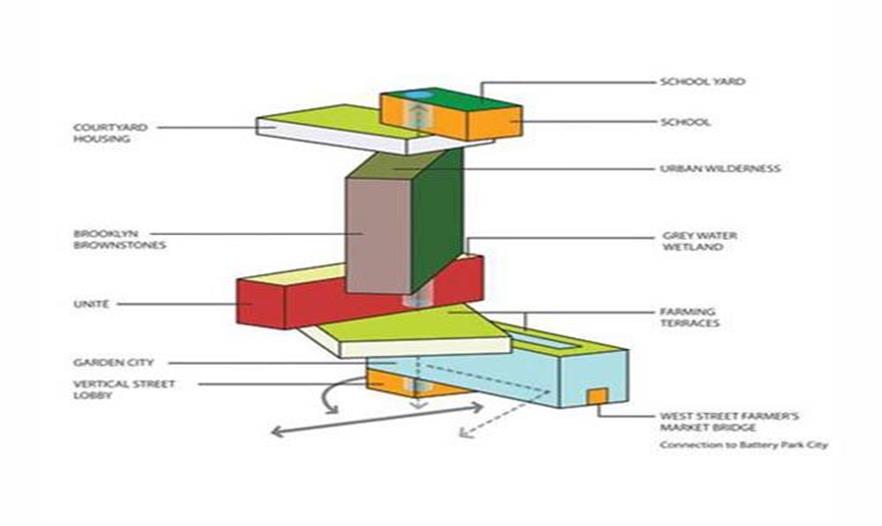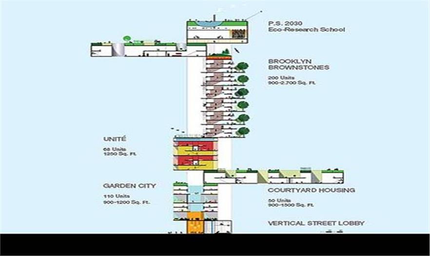 在水循環(huán)系統(tǒng)和廢物系統(tǒng)這一區(qū)域,被收集的雨水可以用來沖廁所,灌溉,洗滌以及水產(chǎn)養(yǎng)殖。生活污水在生活污水處理池中過濾然后再利用,作為沖廁水和灌溉用水。而最不清潔的污水在水處理設(shè)施中經(jīng)過過濾和循環(huán)之后再移送到建筑的能源系統(tǒng)中。供暖和能源系統(tǒng)通過堆肥,即一個(gè)“垃圾焚化爐”來實(shí)現(xiàn),提供地?zé)帷6柲芡饬⒚?,風(fēng)力渦輪機(jī)和一個(gè)熱電廠則為社區(qū)提供了一個(gè)公共浴池,一個(gè)高溫瑜珈中心并為城市中的無家可歸者提供了一個(gè)暖房。在這座建筑的頂部是一所生態(tài)研究學(xué)校,PS2030(為紀(jì)念市長頒布的紐約發(fā)展計(jì)劃planyc 2030)。