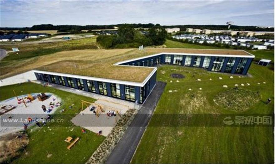 該托兒所是為56個0-3歲的嬰兒及80個3-6歲的兒童設(shè)計(jì)的,坐落于Bernts市最高處。該建筑物巨大的綠色屋頂嵌入山體,建筑物南面有開敞的景觀和操場,陽光亦從南方射入。