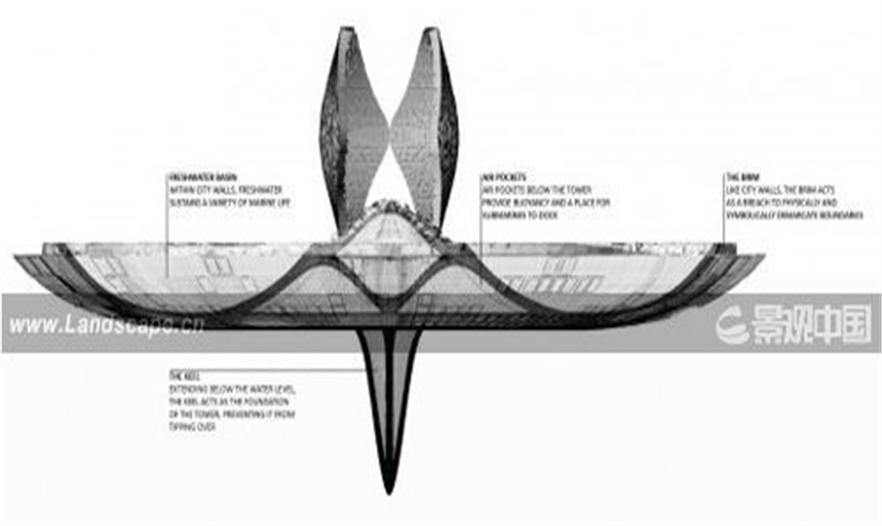 隨著人口的增長(zhǎng),建筑中還可以增加許多插件部分,增加建筑高度,擴(kuò)展建筑范圍,這就像填海工程一樣。海平面下有長(zhǎng)達(dá)800米的“倒置塔”,可以維持建筑直立漂浮,不會(huì)傾倒。圍繞在建筑周圍的是一個(gè)巨大的碗狀結(jié)構(gòu)既可以提供浮力,又可以像“護(hù)城墻“一樣保護(hù)建筑不受海水的侵襲。這個(gè)漂浮島將乘風(fēng)破浪,環(huán)游世界,直到找到一片富饒美好的新天地。