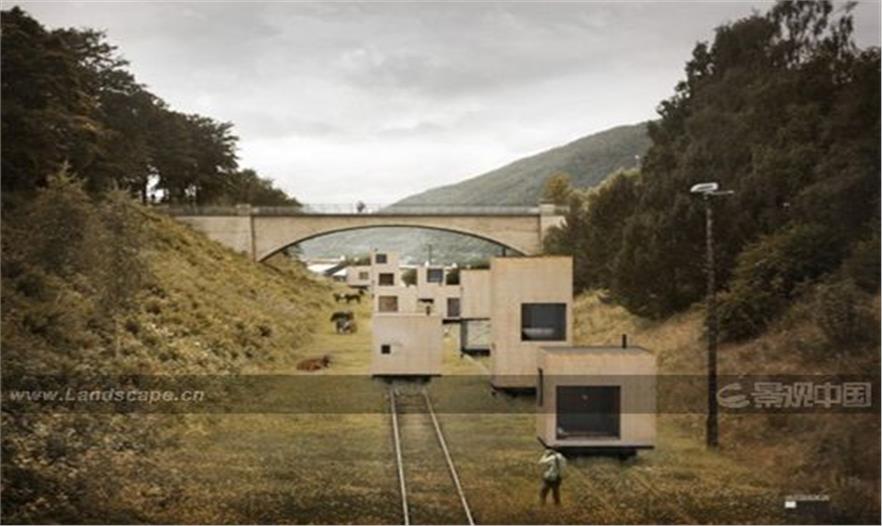 該方案希望能將安道爾森尼斯鎮(zhèn)舊的工業(yè)鐵道區(qū)改造為一種新的移動建筑設施,這些建筑可以隨著季節(jié)與情況的變化而來回移動。比如說,設計師在這個方案中設計了一個“滾動的”旅館,一個“滾動的”公共澡堂和一個“滾動的”音樂廳。