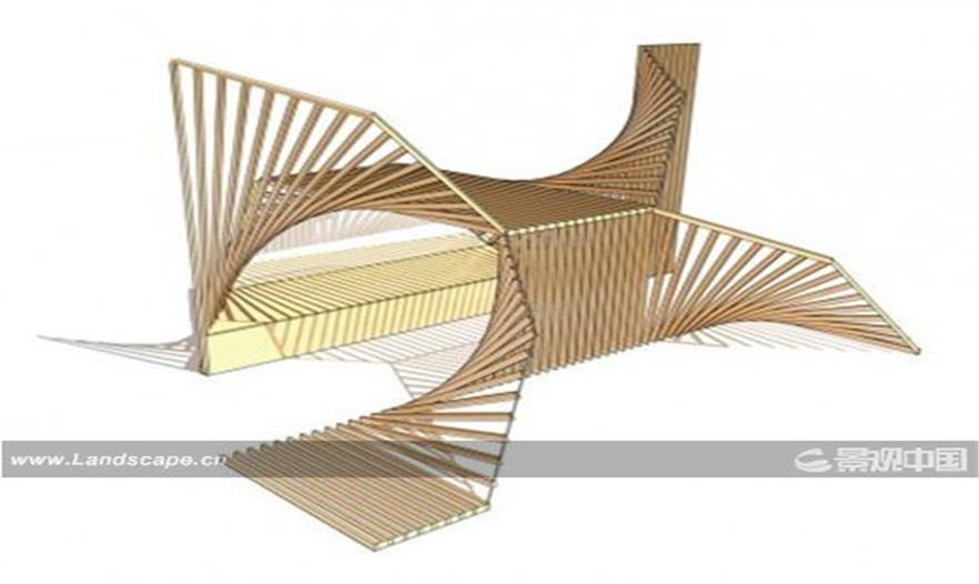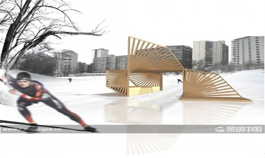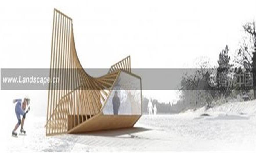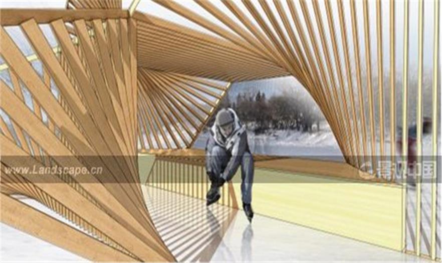 設(shè)計(jì)師把暖亭的表面——它組成了滑道——進(jìn)行扭轉(zhuǎn),以滿足滑冰者進(jìn)出暖亭休息活動的空間需要。此外,這些雙曲面并不是這種的表面,而是一連串的橫梁,通過簡單的旋轉(zhuǎn)獲得了復(fù)雜的曲率結(jié)構(gòu)。設(shè)計(jì)師通過使用木材壁骨來調(diào)和視覺效果中的光與影,動與靜,開放與私密。暖亭中唯一沒有與木材壁骨結(jié)構(gòu)固定在一起的部分是位于暖亭中央的長椅,這個長椅可供使用者舒服的休憩,長椅旁的窗戶還框住了景觀。這個“吻之亭”將為造訪者們提供一次非凡的滑冰休閑體驗(yàn)。