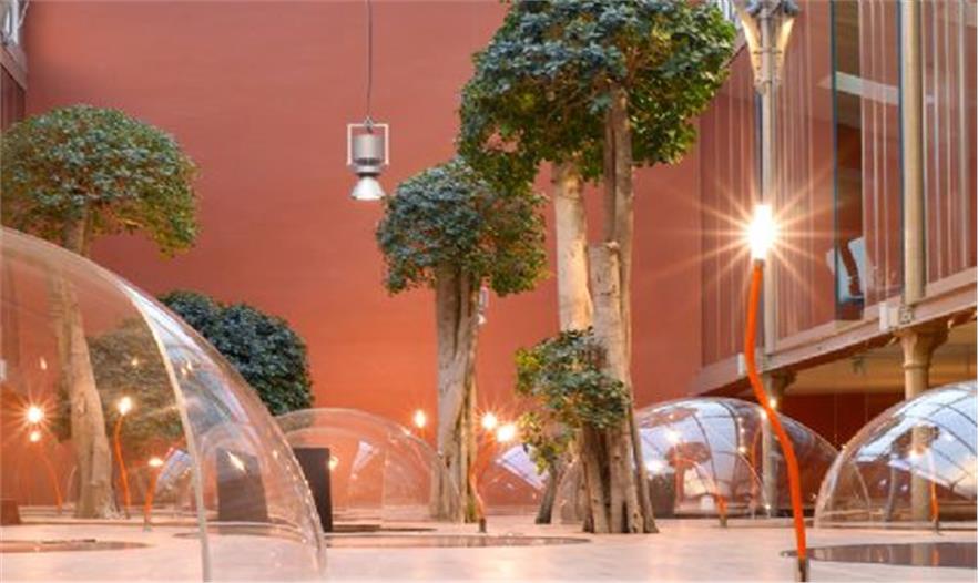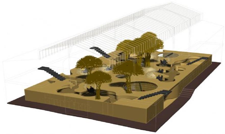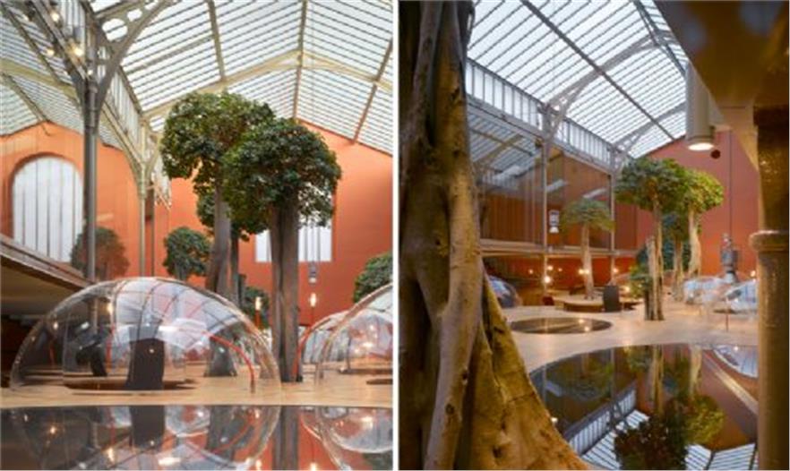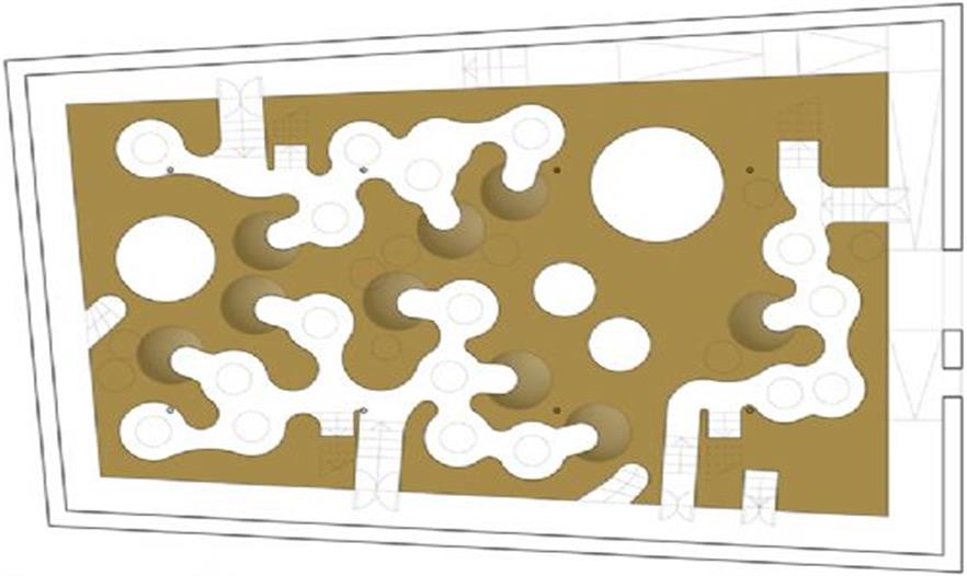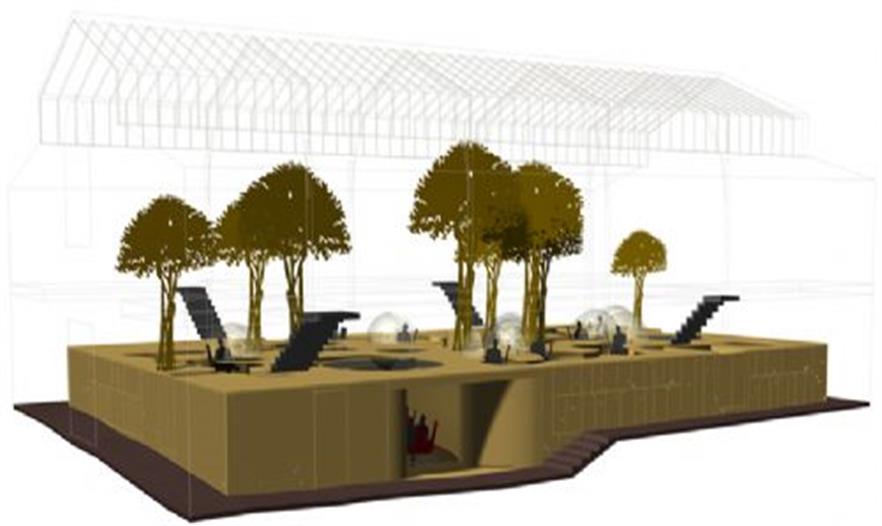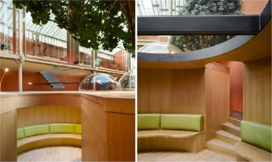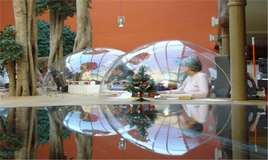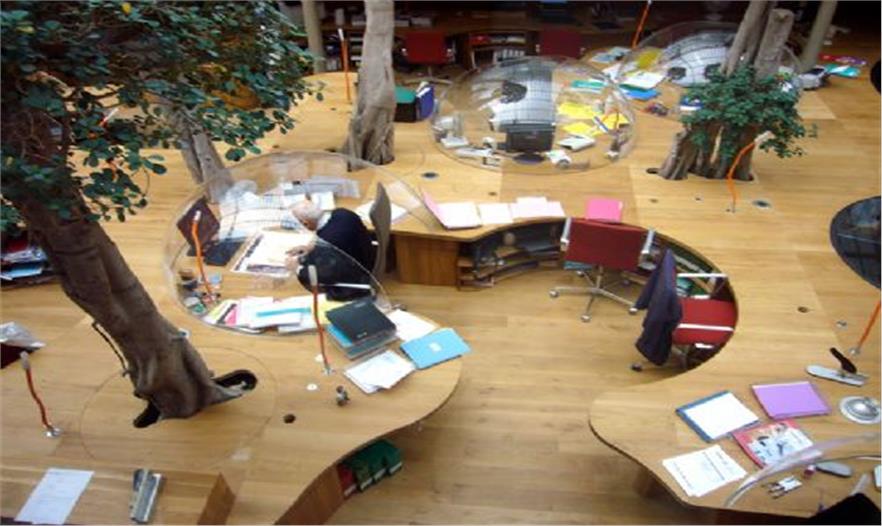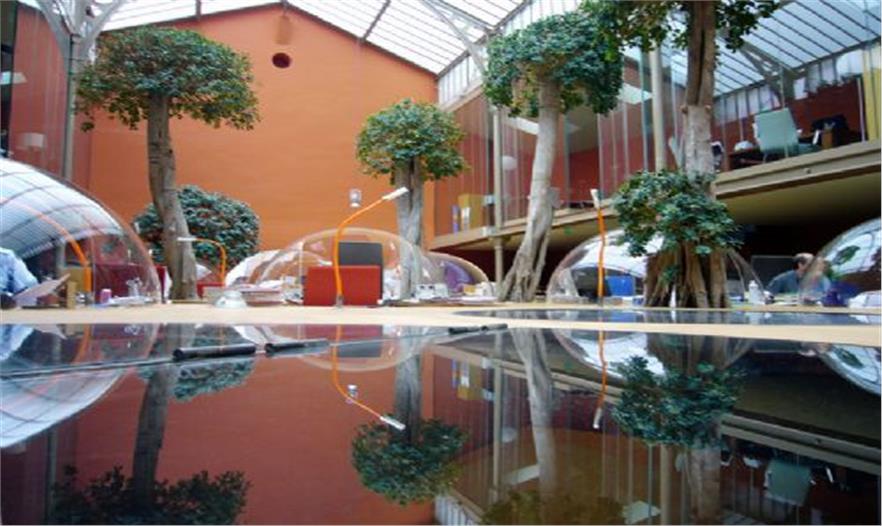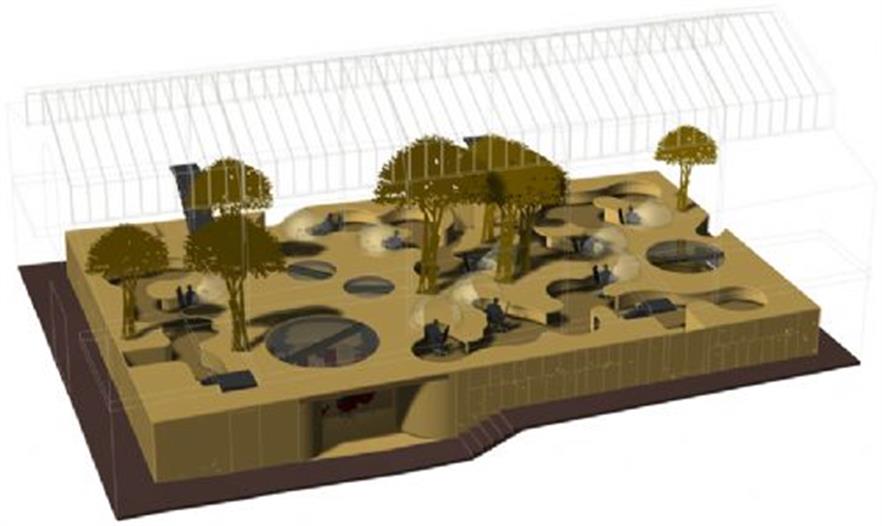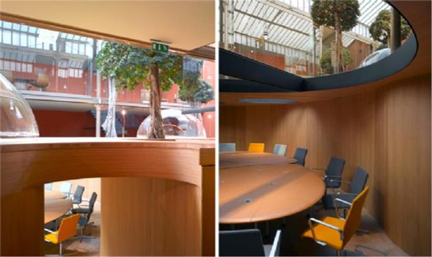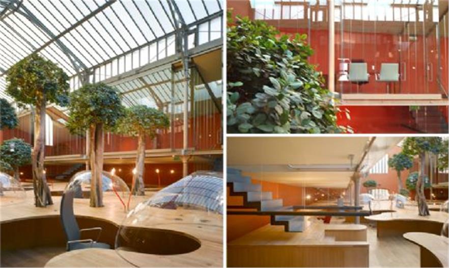 結(jié)構(gòu)體的“最上層”分布了一些曲線形的玻璃罩,它們與木平臺分離,共同形成了一條蜿蜒的小路。這個設(shè)計將各個單元辦公桌有機的布置在一起,同時為使用者提供了獨特的視角和環(huán)境定位。半圓形的有機玻璃罩還有助于隔音,減少職員間相互干擾。ficus panda 樹分散的種植在整個空間中,讓辦公室看起來更像一個茂盛的花房而不是一個單調(diào)的公司機構(gòu)。18.3 m3 的泥土埋在木結(jié)構(gòu)下方,同時還將電腦傳送系統(tǒng),供熱設(shè)備和空調(diào)及水系統(tǒng)布置在最下方。