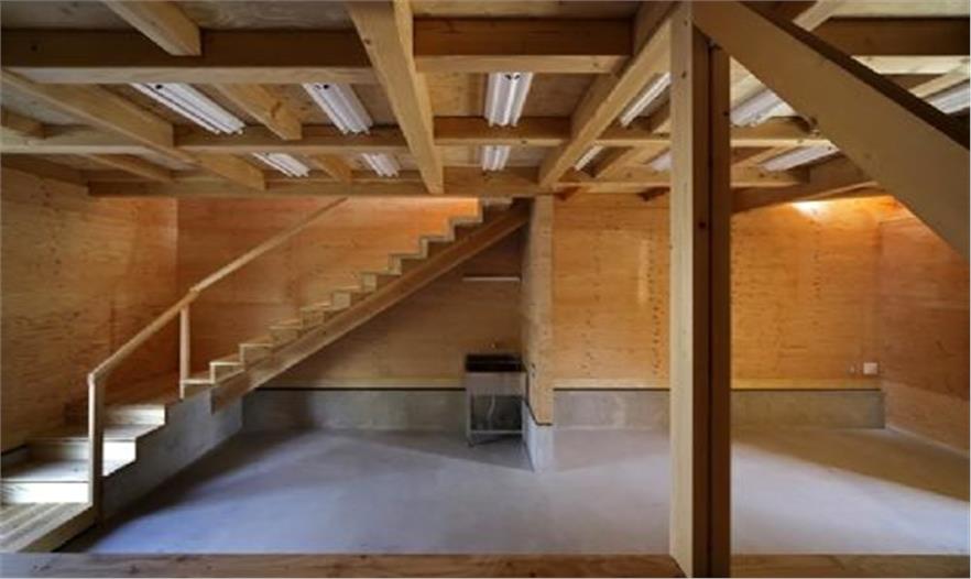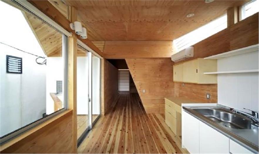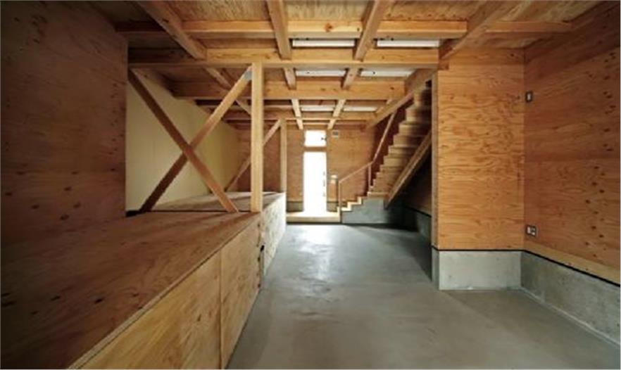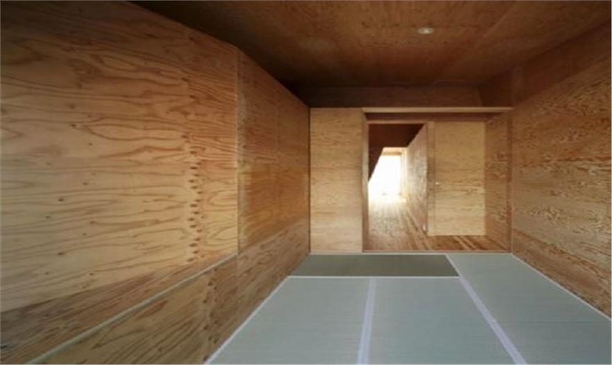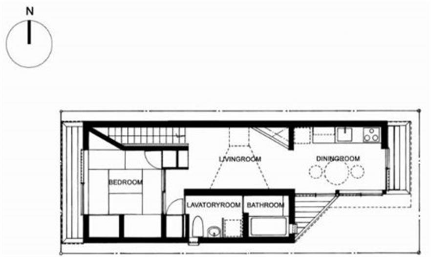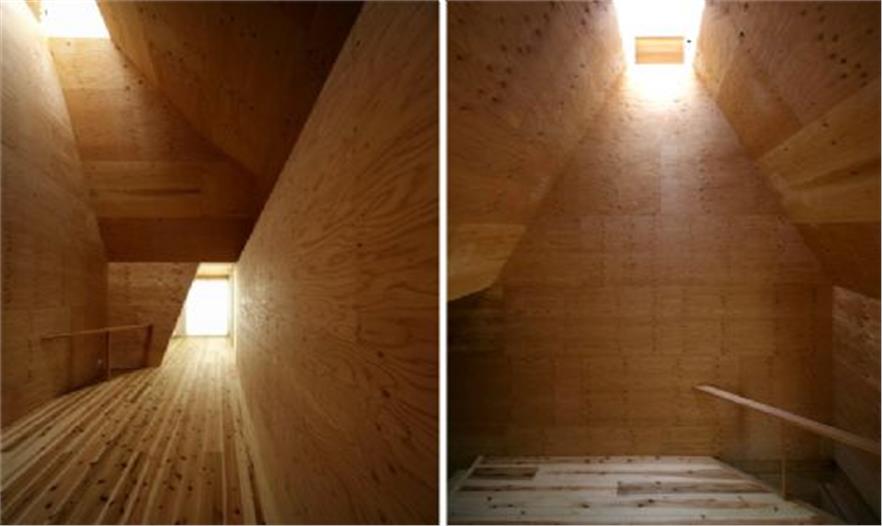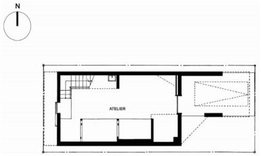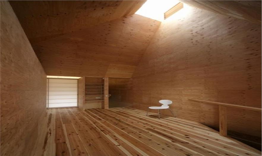 這座建筑是為一堆藝術(shù)家夫婦設(shè)計(jì)的,整座住宅布置簡(jiǎn)潔,不需要很多房間。因?yàn)榻ㄖ哪媳眱蓚?cè)都鄰近其它住宅,設(shè)計(jì)師就利用了頭頂天光以汲取充足的室內(nèi)光線。有角度的切面狀墻面為起居室創(chuàng)造了一個(gè)動(dòng)感的氛圍,雕塑化的,煙囪式的空間為使用者創(chuàng)造了一個(gè)適于冥想的空間。室內(nèi)墻面被膠合板和木料包裹,建筑師用有趣而奇特的手法將這座住宅設(shè)計(jì)的非常具有新意。