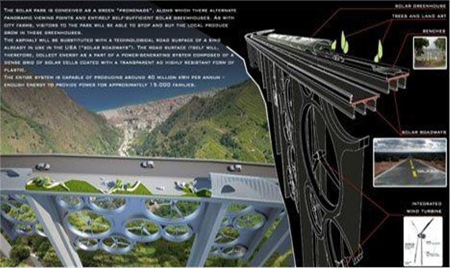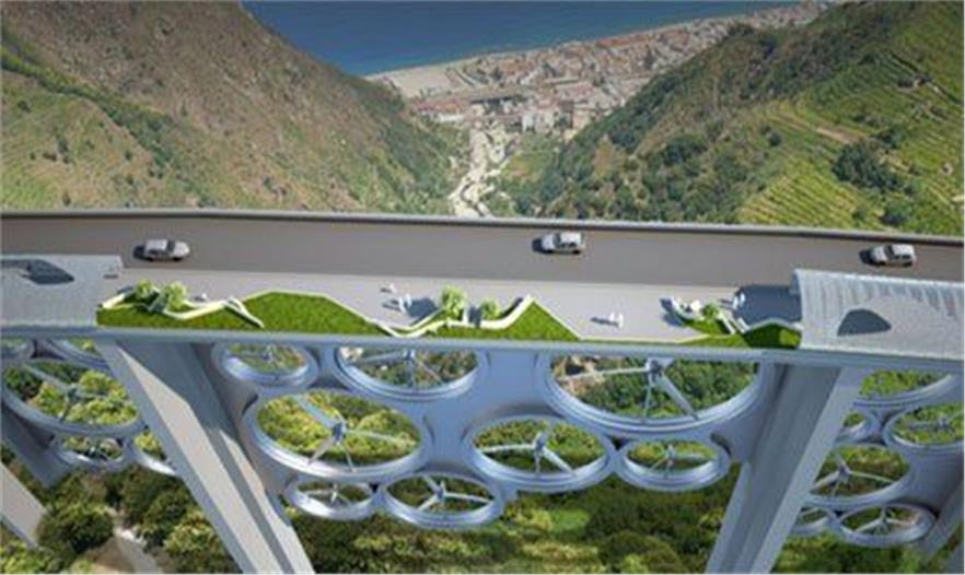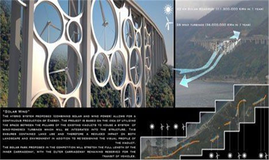 這座橋梁是為意大利特定地區(qū)專門設(shè)計(jì)的。作為Solar Park Works——太陽(yáng)能高速公路設(shè)計(jì)大賽的一部分,要求設(shè)計(jì)師對(duì)巴涅拉和斯希拉之間一段廢棄的高架公路橋重新設(shè)計(jì)。太陽(yáng)能風(fēng)力發(fā)電橋這一富有革新性的設(shè)計(jì)理念是3名設(shè)計(jì)師——弗朗西斯科-克拉羅希(Francesco Colarossi)、喬凡娜-薩拉齊諾(Giovanna Saracino)和路易薩-薩拉齊諾(Luisa Saracino)集積智慧的結(jié)晶。他們看到了地理位置潛在優(yōu)越——始終受到側(cè)風(fēng)侵襲并且長(zhǎng)期處于地中海強(qiáng)日光的照射之下。