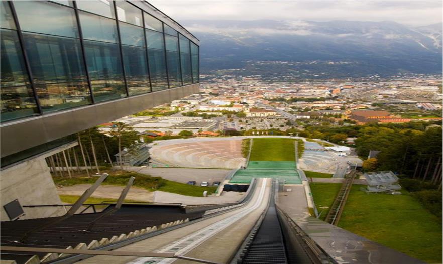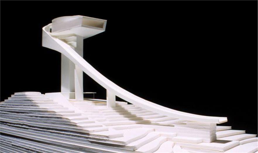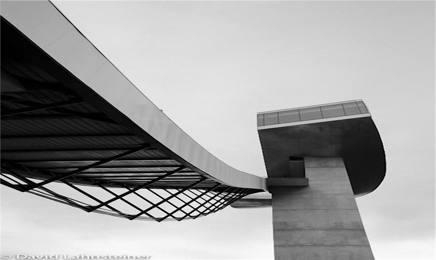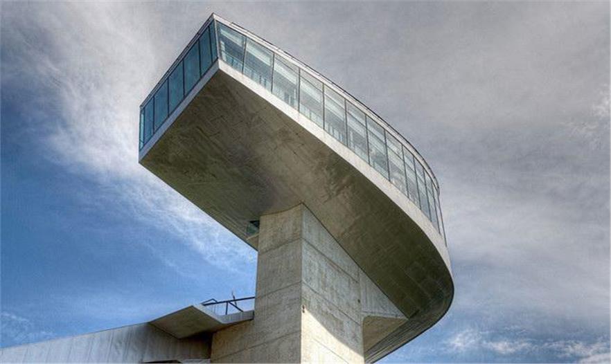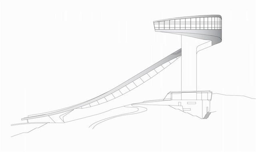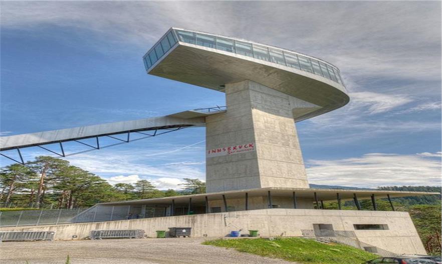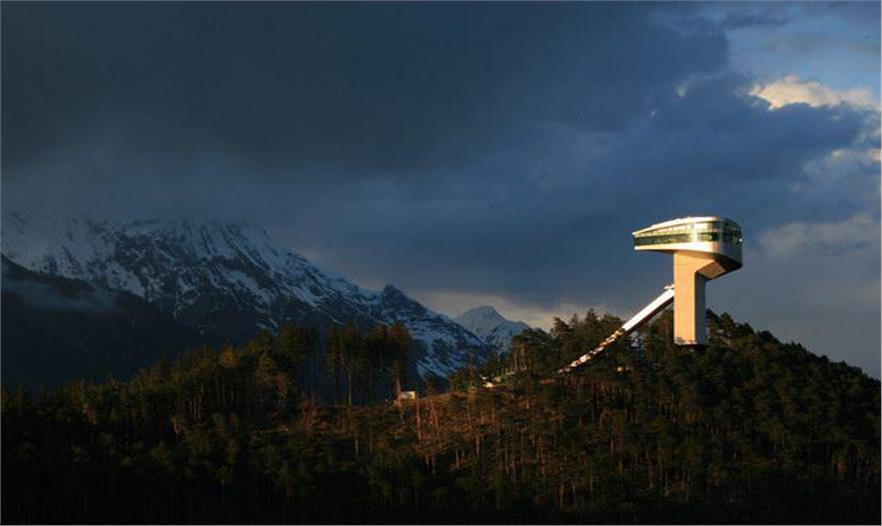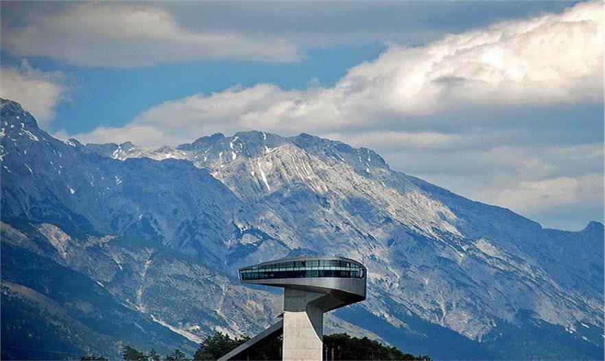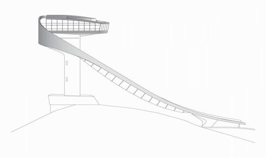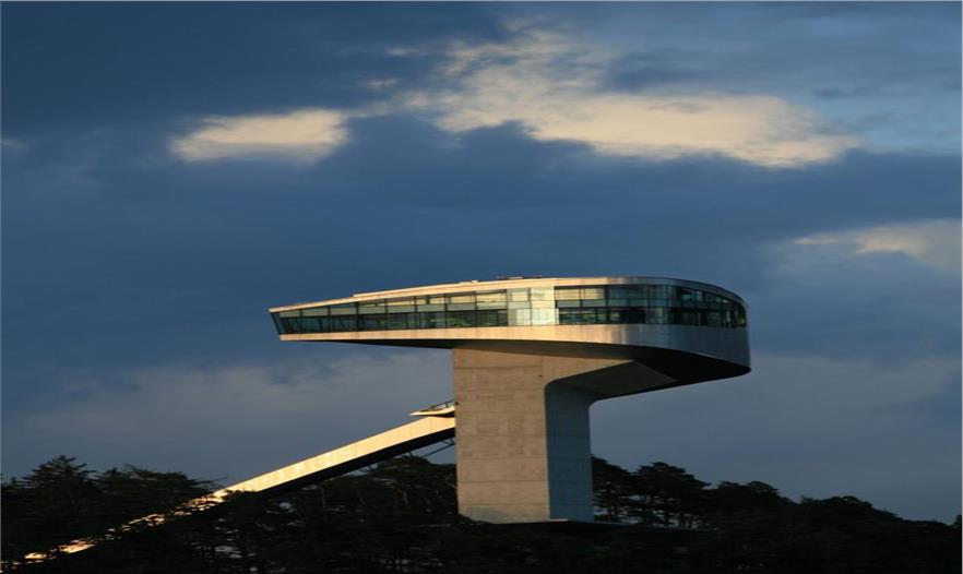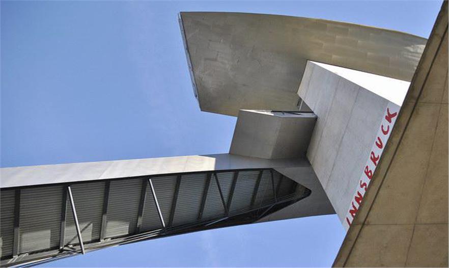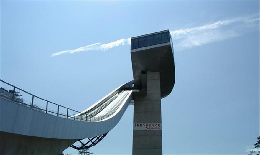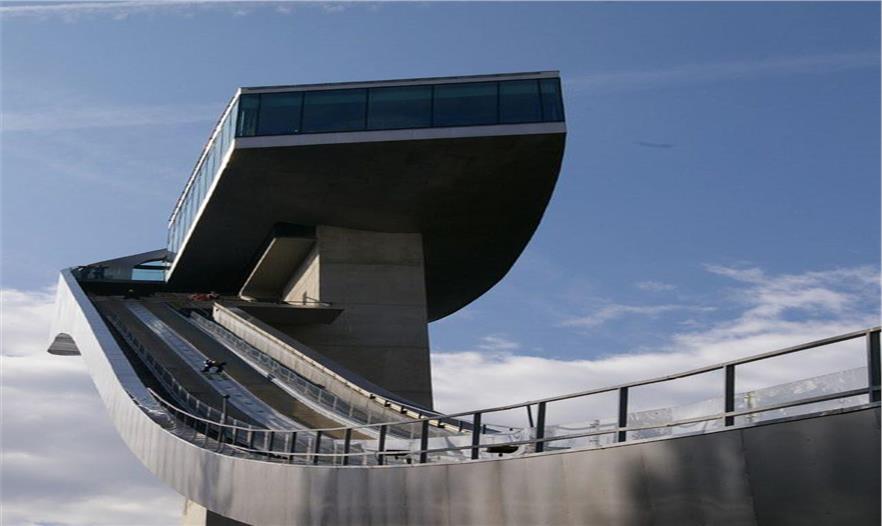 伯吉瑟爾滑雪臺由著名女建筑設(shè)計師哈迪德設(shè)計,長達90米、高近50米的滑雪臺由一塔一橋組成,依山而建,直指長空。該雪臺集專業(yè)設(shè)備場地和公共空間于一體,既是比賽的絕佳場所,也是旅游的觀光圣地,建筑物本身包含了一個咖啡館和一個觀景平臺。兩座電梯可將游客帶至距伯吉瑟爾山頂峰40米高處的咖啡廳。在此,游客們可以俯瞰阿爾卑斯山脈壯觀的風(fēng)景,同時欣賞運動員滑破長空的奮力一跳。這座高90米,像塔又像橋的建筑原本是為奧地利冬奧會設(shè)計,以替換原本殘破的舊滑雪臺的,不料2002年8月落成后,迅速成為哈迪德的標志性作品。