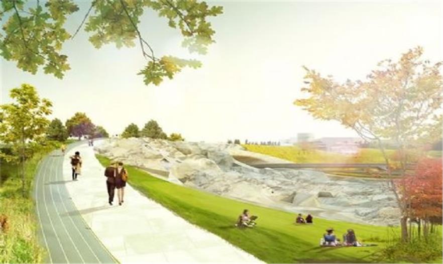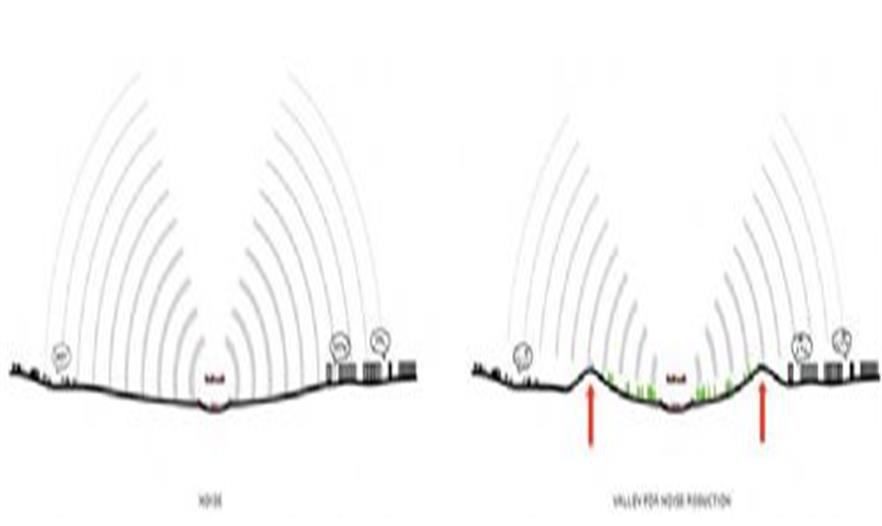方案設(shè)計(jì)了一個(gè)輕微上升的地形,用以削弱來自市中心的噪音,建筑師在城市和周邊社區(qū)之間設(shè)計(jì)了一個(gè)碗狀的山谷。為了給這一地區(qū)的居民創(chuàng)造一個(gè)多樣化的體驗(yàn),這個(gè)580 m2 的設(shè)計(jì)被分成若干個(gè)區(qū)塊,每一部分都設(shè)計(jì)了不同的景觀,從松樹/橡樹林到濕地;從草甸到山丘。