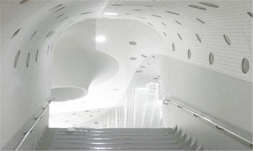 雙層穿孔板表皮模仿了蛇皮的圖案,反光的金屬材料反射出了周邊景色。投射在建筑表皮上的景色會根據(jù)天色變化以及周邊的活動而發(fā)生微妙改變。夜晚,建筑內(nèi)部的光線透過穿孔鋼板散射出來,無數(shù)的光點(diǎn)將包裹這個不銹鋼管狀建筑物。