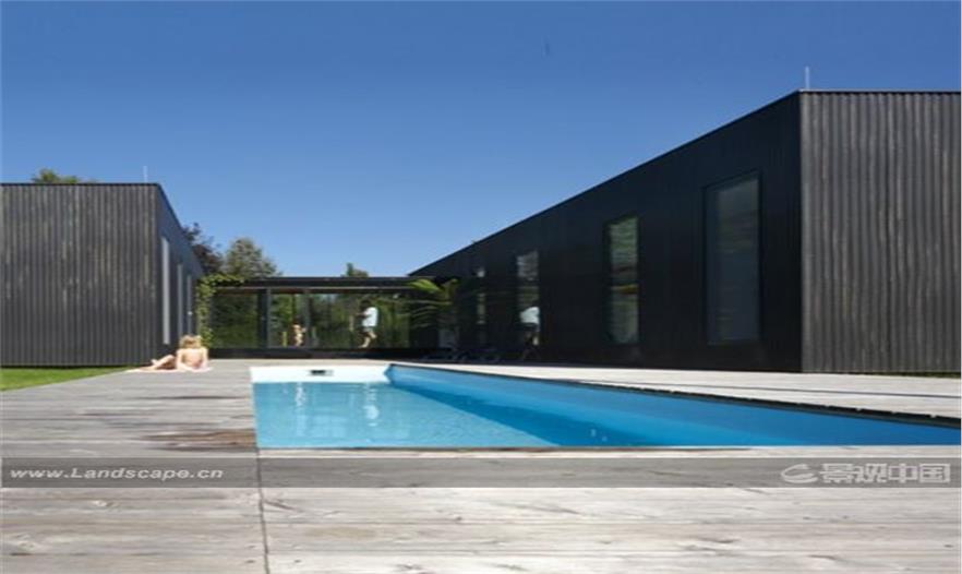 裝有狹長水池的露臺(tái)嵌在兩座建筑中,因此通風(fēng)和私密性得到了保護(hù)??赏ㄟ^廚房進(jìn)入到室內(nèi),起居室和門廳同樣可作為父母的臥室。