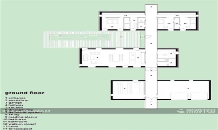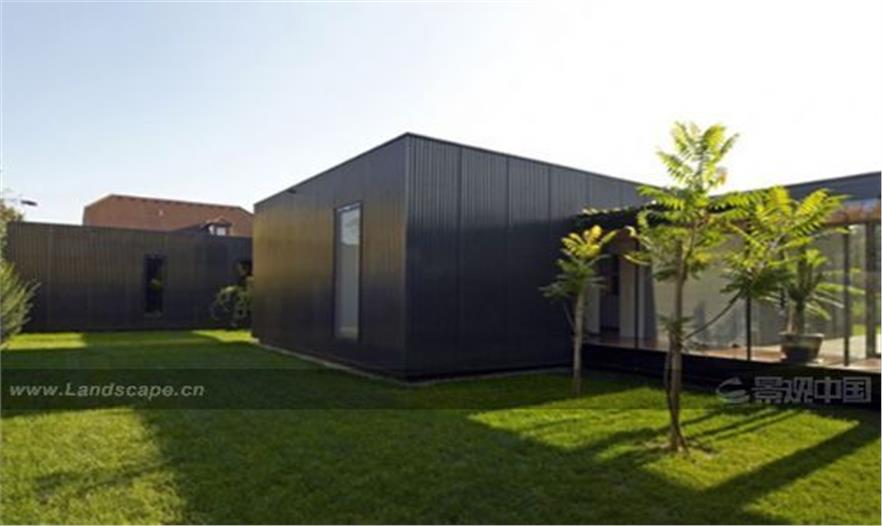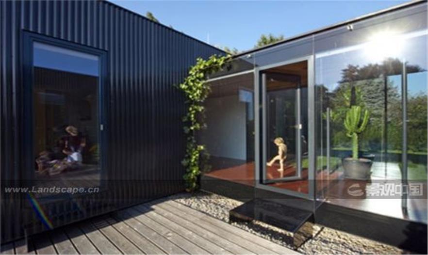 不同類型的功能可歸納為三種類似于“容器”的結(jié)構(gòu)。街道處的主入口以頂棚形式出現(xiàn)以達(dá)到標(biāo)識(shí)效果,通向全封閉的玻璃通道,在花園一側(cè)以出挑臺(tái)的形式結(jié)束。車庫和儲(chǔ)藏室位于三種“容器”中的第一個(gè),起居室位于第二個(gè)“容器”中,可從三面獲得自然光。連接兩個(gè)“容器”的連廊則作為門廊。一個(gè)蔬菜園直接同廚房相連。