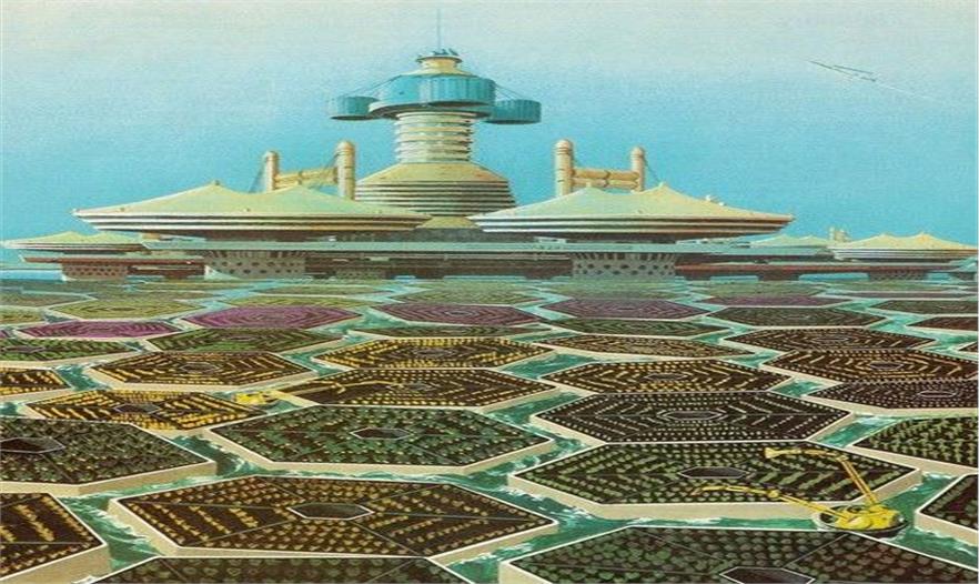1984年,沃爾特-迪斯尼對(duì)2050年時(shí)近海農(nóng)業(yè)的可能情形產(chǎn)生了濃厚興趣。在他出版的《農(nóng)業(yè)的未來(lái)世界》一書中,迪斯尼設(shè)計(jì)了這樣一個(gè)未來(lái)海上城市。他介紹說(shuō),“在未來(lái)的一座海上城市周圍,農(nóng)作物生長(zhǎng)于漂浮的平臺(tái)之上,機(jī)器人負(fù)責(zé)收割。來(lái)自海洋的水經(jīng)過(guò)脫鹽淡化后,可以用來(lái)澆灌農(nóng)作物?!?