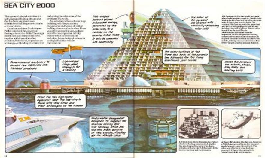 “海洋城市2000”的設計理念來自巴克敏斯特-福勒爾和保羅-索萊里。它是一個建于漂浮平臺上的金字塔形建筑物,表面覆蓋著太陽能電池板。在金字塔上,建有公寓、商店、花園、學校等設施。水下的設備則可以提供養(yǎng)魚、海底采礦等功能。