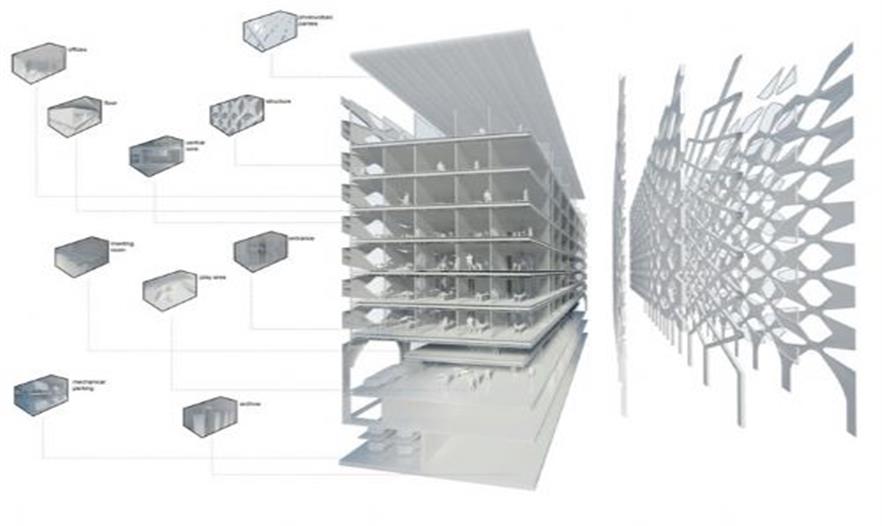 整棟建筑地上9層、地下2層。一層由一個(gè)連廊構(gòu)成,通過把建筑主立面的周邊線條拉伸而產(chǎn)生,這就使得街道和新的大樓融合為一個(gè)整體。中庭入口門廊是一個(gè)迎賓區(qū)域,把兒童區(qū)和咖啡廳以及工作人員和行人的通道分隔開來。