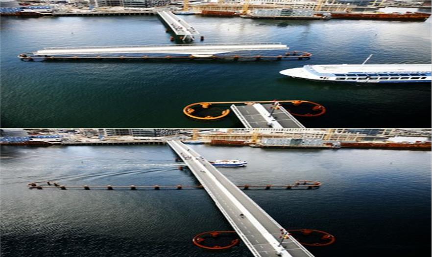 由DISSING+WEITLING 事務(wù)所設(shè)計(jì)的哥本哈根人行與自行車橋 Bryggebro(Quay Bridge),集合功能、簡潔、美感于一身。大型輪船過來時(shí)橋會轉(zhuǎn)動(dòng)起來讓大船順利通過,橋梁設(shè)計(jì)簡潔,并通過燈光來突出橋的結(jié)構(gòu)之美,當(dāng)夜幕降臨,如同一條漂浮在水面上的光帶。
