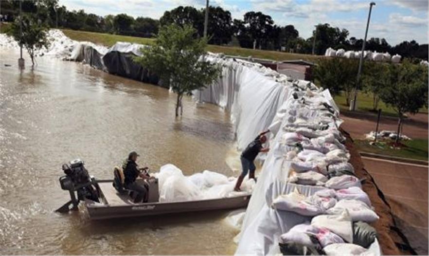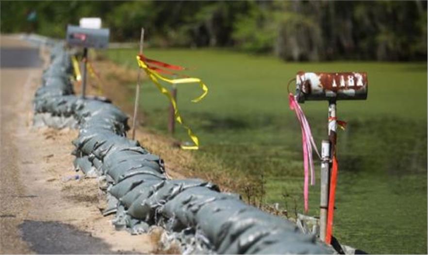 路易斯安那州堆積在一條馬路旁的防洪沙袋。