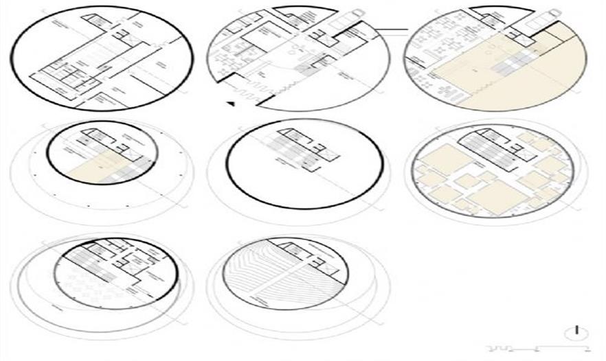 博物館由若干大小不一的圓形樓板堆疊而成,以提供理想的功能空間。建筑在各個(gè)平面上被剖切開來,圓形的體量相互錯(cuò)動(dòng)創(chuàng)造了動(dòng)感的視覺效果。建筑內(nèi)部大廳的主樓梯和咨詢臺(tái)選用了帶天然木紋的飾面板,創(chuàng)造了一個(gè)溫暖而親切的空間。