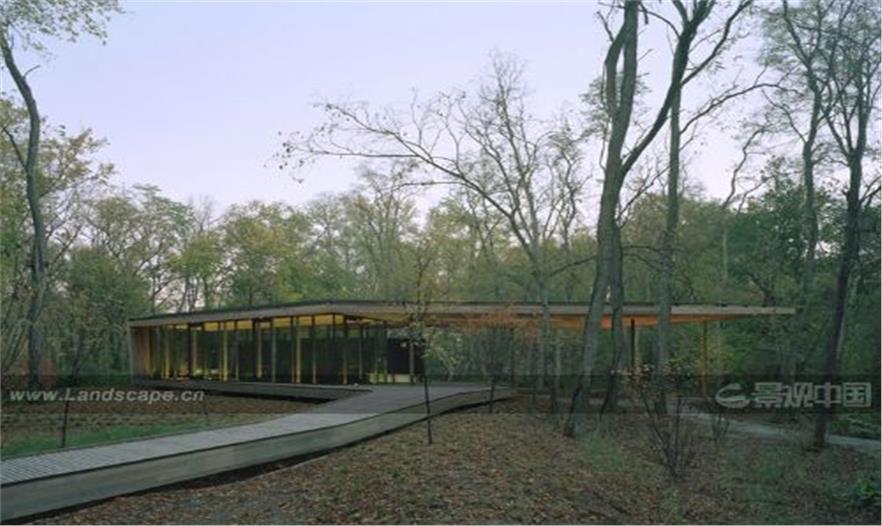 游客觀光亭使用地面照明,用支撐立柱分隔開(kāi)來(lái),其中一個(gè)隱蔽的水平框架結(jié)構(gòu)同時(shí)會(huì)產(chǎn)生拉力和壓力。一個(gè)連續(xù)的由木板組成的穿孔表面形成了一個(gè)由鋼鐵外骨骼支撐的半透明外表皮。墻壁、天花板和地板裝飾可以使得自然光和濕氣通過(guò)其進(jìn)行過(guò)濾。外表皮夾層玻璃的折疊平面附有程序單元。在這里,有頂?shù)耐獠靠臻g和內(nèi)部空間幾乎同樣地成為了能夠進(jìn)行可交換和具有多功能的空間。樹(shù)林在玻璃覆層上的倒影起到了把建筑隱藏于周圍環(huán)境的作用——采用一種低低地懸垂的形式,沐浴在斑駁的光影中,似乎在樹(shù)木間浮動(dòng),創(chuàng)造出了公園里的一個(gè)幻象。