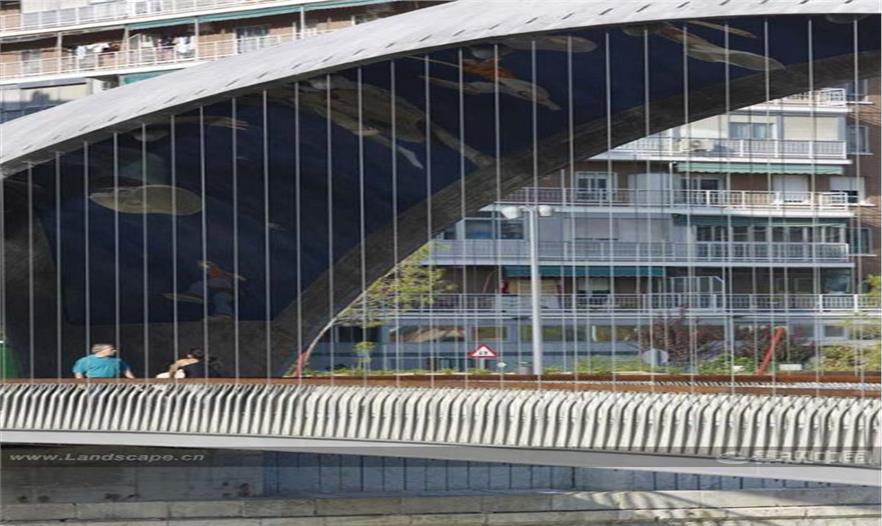 與通常實(shí)用的人行天橋不同,設(shè)計(jì)師在這里創(chuàng)造了一個(gè)能夠感知河流的場(chǎng)所。一座有著粗糙混凝土穹頂?shù)男腥颂鞓颍瑑蓚?cè)有著類似鯨魚脊骨的鋼纜。穹頂由西班牙藝術(shù)家Daniel Canogar設(shè)計(jì),經(jīng)過天橋時(shí)可以觀察到內(nèi)部的馬賽克裝飾非常漂亮。同時(shí),在穹頂?shù)倪吘壯b備照明系統(tǒng),使得這件藝術(shù)品在燈光反射下更加絢爛奪目。