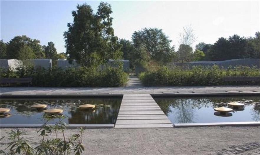 為了這個區(qū)域的發(fā)展,在這里新增了線性構(gòu)筑物。這個區(qū)域總體上是由平行的木架排列而成的,應(yīng)用了多種寬度和設(shè)計準(zhǔn)則。有的木架結(jié)合疏離將區(qū)域劃分成了一個個空間組分。一系列池塘和骨灰龕遍布在原有土葬區(qū)域間隙。樺樹散落在整個區(qū)域中。