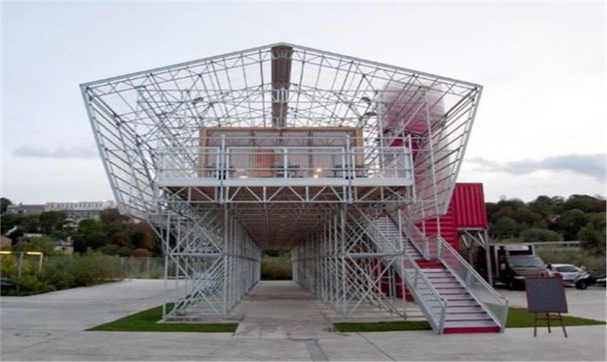 顧客要通過一個(gè)室外樓梯或是紅色升降梯進(jìn)入餐廳內(nèi)部和戶外就餐平臺。鋼管與施工用的腳手架共同支撐起整個(gè)建筑,并將內(nèi)部一個(gè)木制長方形體量包圍起來。半透明的玻璃立面包裹了鋼骨架外殼,同時(shí)在夜晚創(chuàng)造了奇妙的燈光效果。