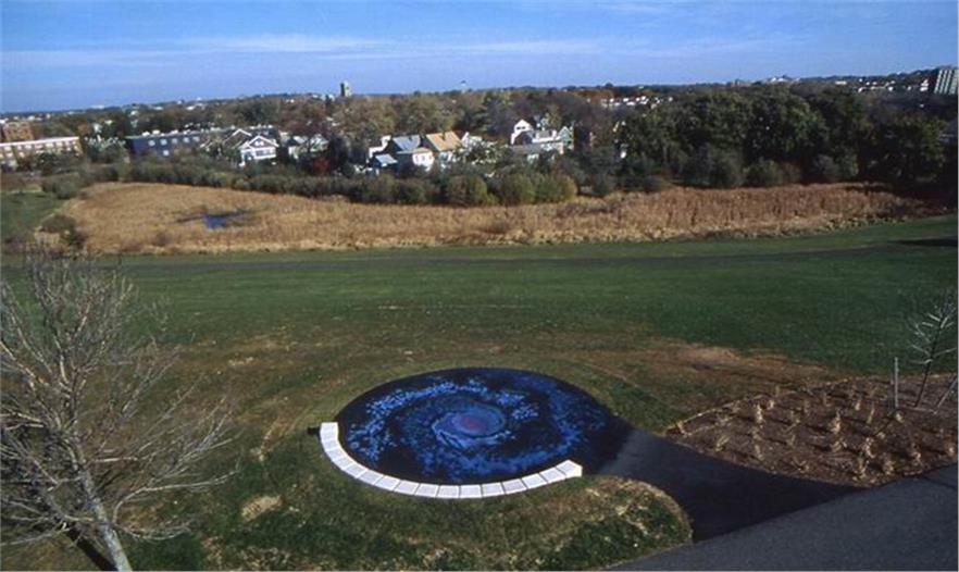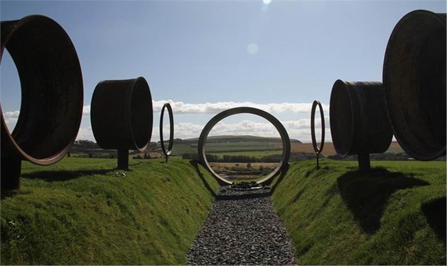 '上圖的裝置是用下水道污水管制作的, 透過中心圓環(huán)看到的遠(yuǎn)景是一座擁有3.75億年歷史的火山' charles jencks