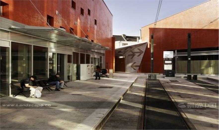頂棚最后終結(jié)在一個(gè)著名的坡道上,暗示著通道連接這輕軌的終點(diǎn)和商場(chǎng)及地鐵的入口。通道的地板鋪設(shè)了灰色的花崗巖,作為鬧市區(qū)公共空間規(guī)劃布局的延伸。