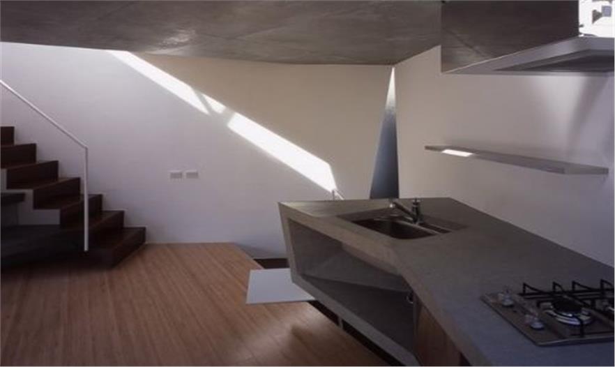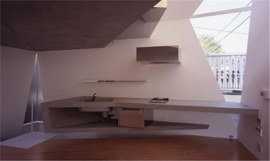 因?yàn)榉孔咏ㄔ煸谛逼轮?,山下泰裕在建筑基部因地制宜,為主人的愛車開辟了室外車庫,這一底部掏空的造型是整個(gè)建筑的亮點(diǎn)之一。另一方面的精彩在于內(nèi)部功能和設(shè)施的和諧,這絕不是一間中看不中用的住宅,實(shí)際上,它的內(nèi)部空間相當(dāng)充裕:一樓大部分面積用作車庫,因此客廳和廚房被安排在二樓區(qū)域,三樓是一間小巧玲瓏的淋浴間,而臥室則建在地下,不僅冬暖夏涼,在地震時(shí)還將充當(dāng)庇護(hù)所。
